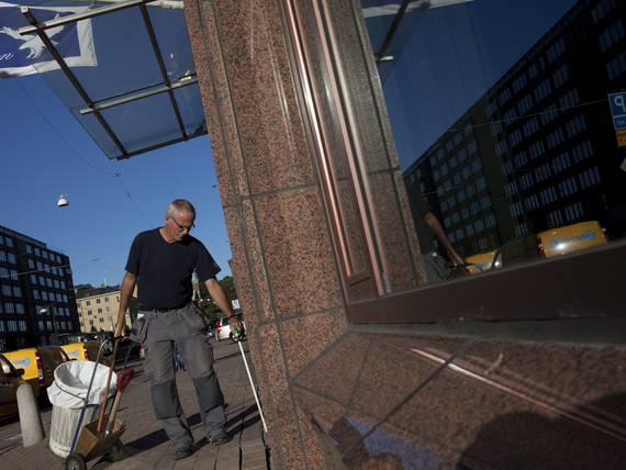 Man städar utanför fastighet.